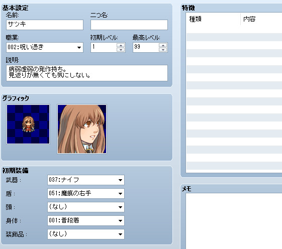 アクター、職業……と考えて、スキルがちょっとデフォルトだと設定とかみ合わないのでスキルも変更を加える、が、しっくりこない。とりあえず保留。