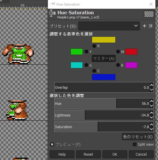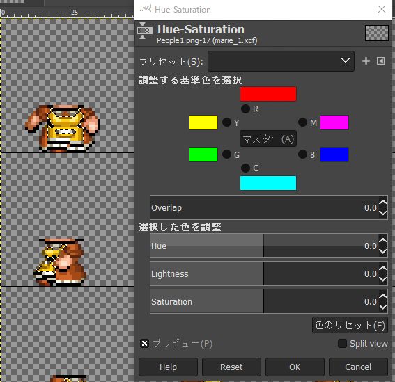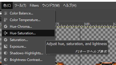 なんかうちのGIMPだと日本語になってないけど、日本語だと「色相ー彩度」という表示らしい。