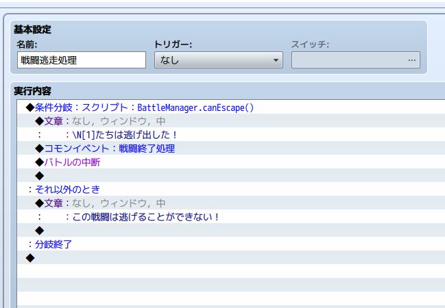 勝利時、敗北時はプラグインというか、スクリプトで介入できるんだけど、逃げるがどうも無理で、どうすっかなぁーという現状。
