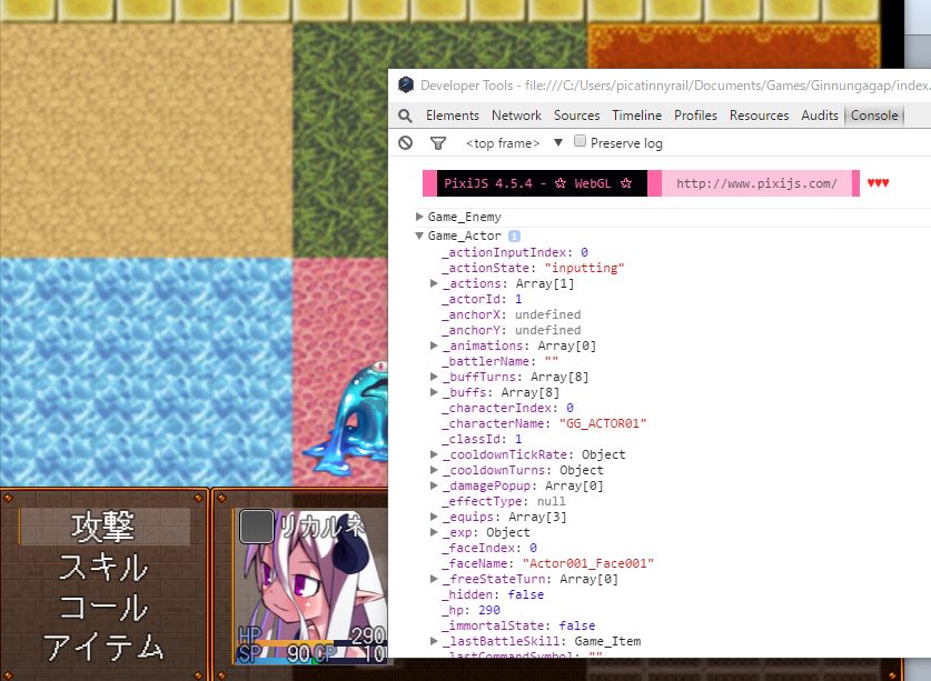 で、戦闘中に使用し、F8キーでいわゆる開発者ツールを呼べるので、そこでConsoleから確認する。