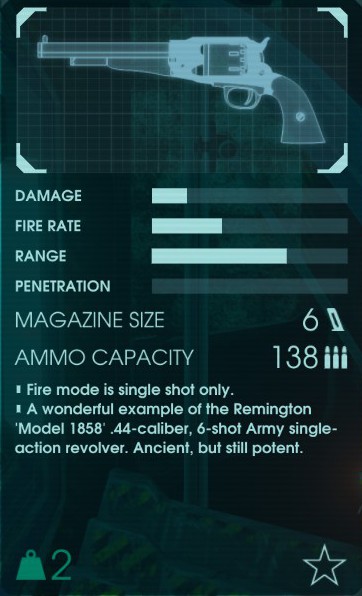 初期武器。名前は「1858 Revolver」。レミントンの凄い古い銃だったはず。