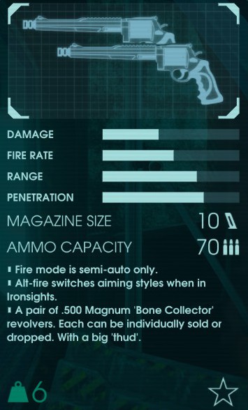全てにハンドガンはエイム重視の1丁、ダメージ重視の2丁持ちを選択することができる。