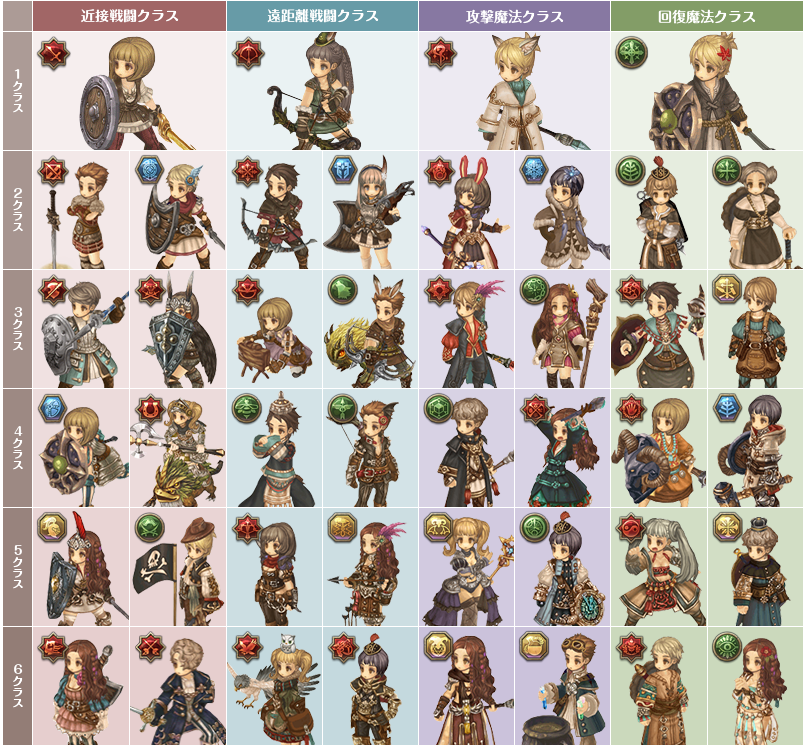 クラス(職業)は4系統×6段階あり、1系統11クラスの総クラス数44となる。